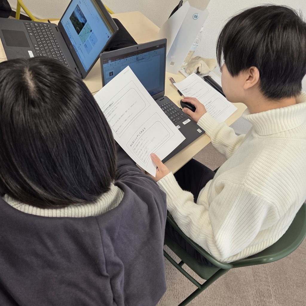 本日は参加者の皆さんと『絶景探し』をしました!ステキな風景を探すだけ…ではありません!グループごとで話し合って実際に絶景を見るために必要な情報をまとめました!こことかどうですか?この場合は…皆さん、真剣に話し合いを進めています(`・ω・´)