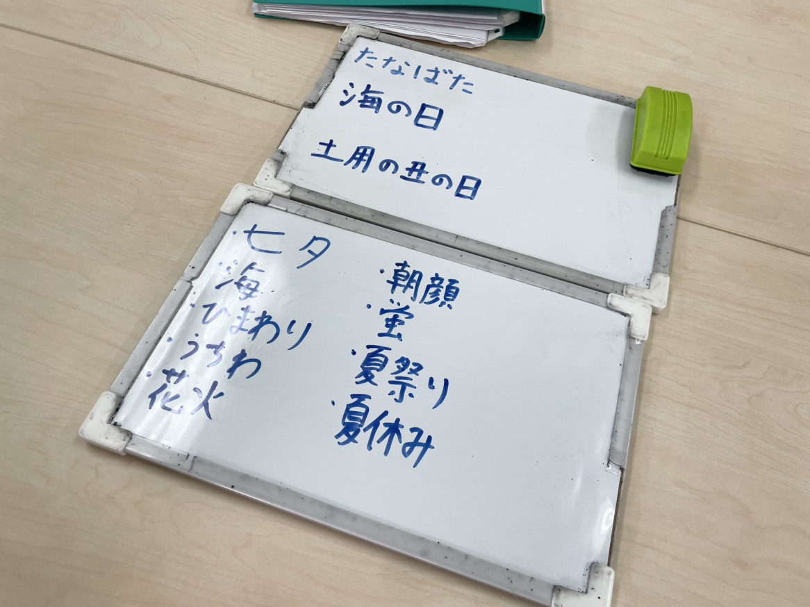 七夕、 花火、海やプール、 夏祭り、とうもろこし、そうめん、うちわ、などなど